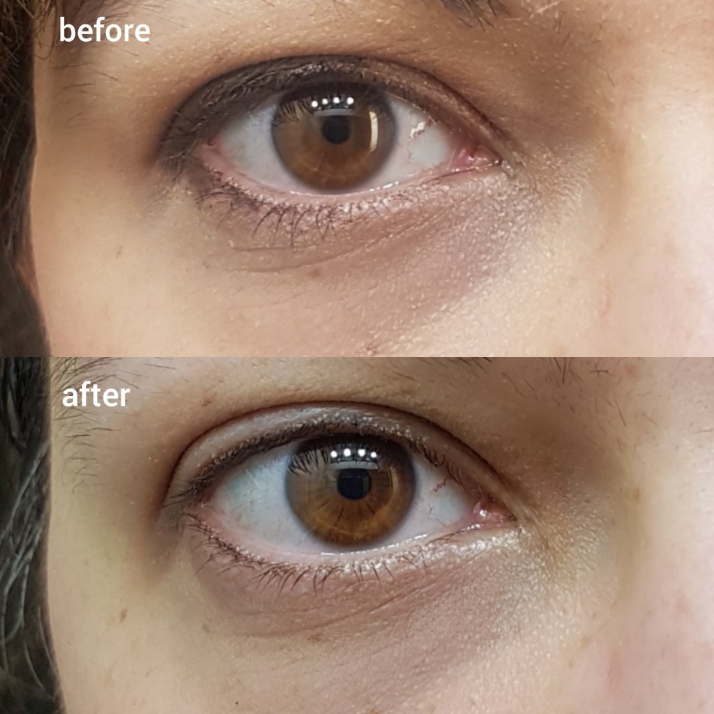 I wear minimal, everyday makeup with waterproof eyeliner, non-waterproof mascara, eye shadow, Anastasia Beverly Hills Brow Wiz, sunscreen from The Ordinary (which is rather thick and heavy on the skin), and the natural coverage foundation from Altilis Beauty. The Squalane Cleanser is able to remove all of the above, rinsing with my hands, no cloth. In looking at the below photo (after cleansing), there is only a smudged bit of black makeup at my outer eye left.