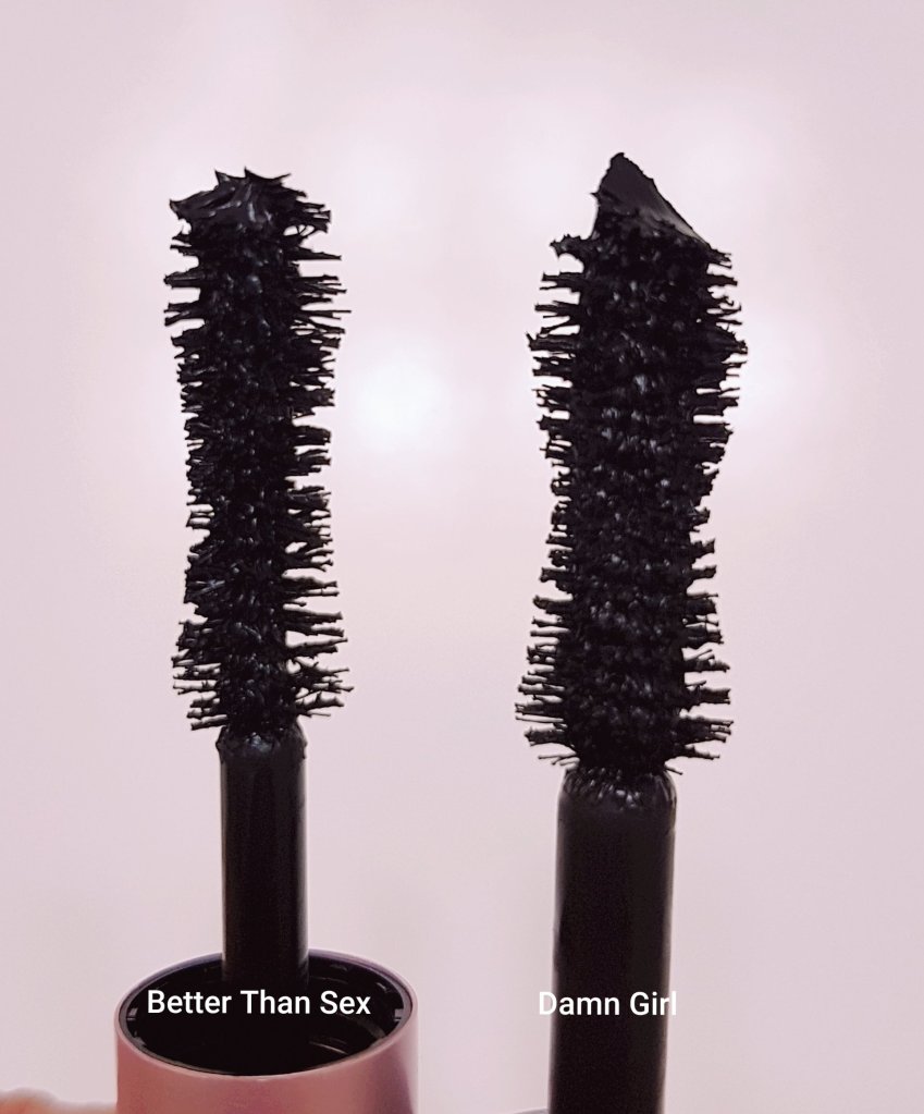 Comparing Better Than Sex (BTS) and Damn Girl (DG), the scent of BTS is slightly less. The bristles generally look the same length (DG has a mix of long and short bristles), perhaps a bit shorter on the in-curve of DG, but the wand is thicker for DG and the brush more of the hourglass curve, making the brush larger overall. The brushes are the same length. DG’s formula is thicker and wetter.