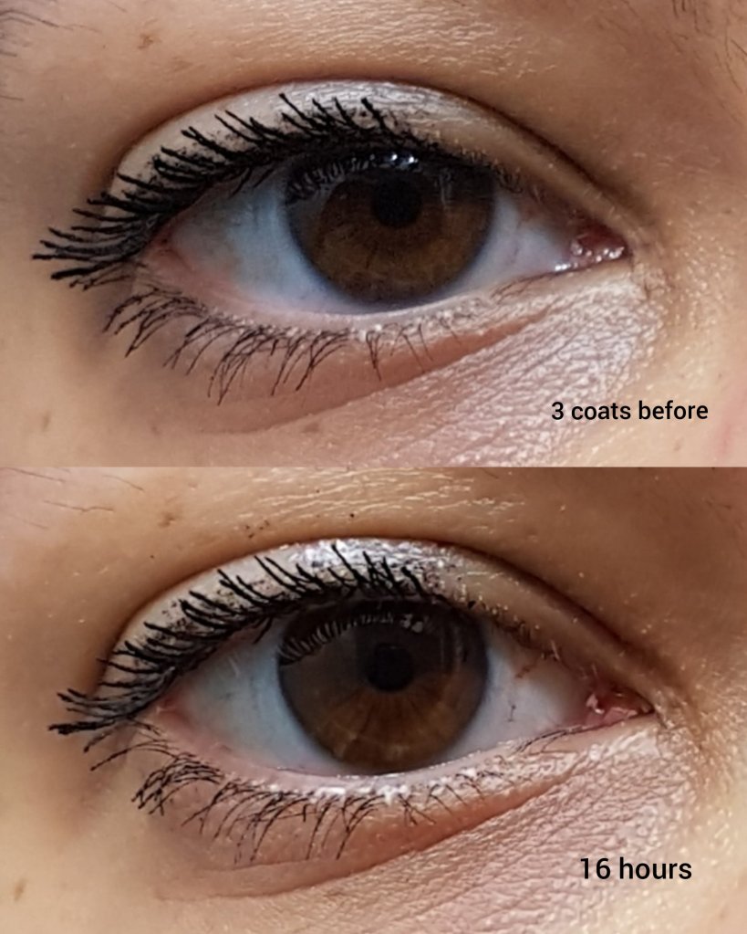 Above, is after 16 hours of wear. There is some clumping and a bit of flaking and a loss of volume and lift.