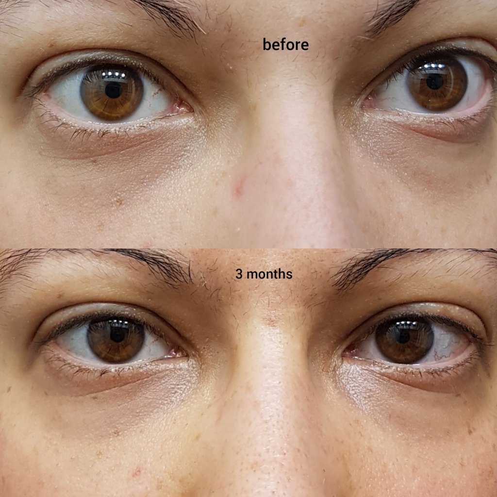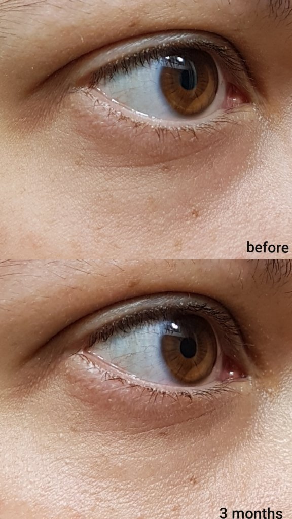 Above, looking at the fine lines, there is a bit of reduction on the lower outer side of the eye and perhaps toward the inner eye area; not so much under the eye. After a couple weeks’ use, I noticed, in the mirror, some reduction in fine lines, but on further use, they seemed to come back and did not reduce further. The puffiness toward the lower eye area is still visible. I don’t see any improvement in puffiness or dark circles in the mirror.