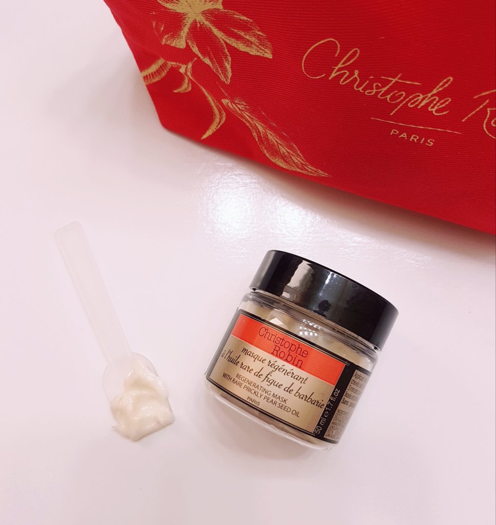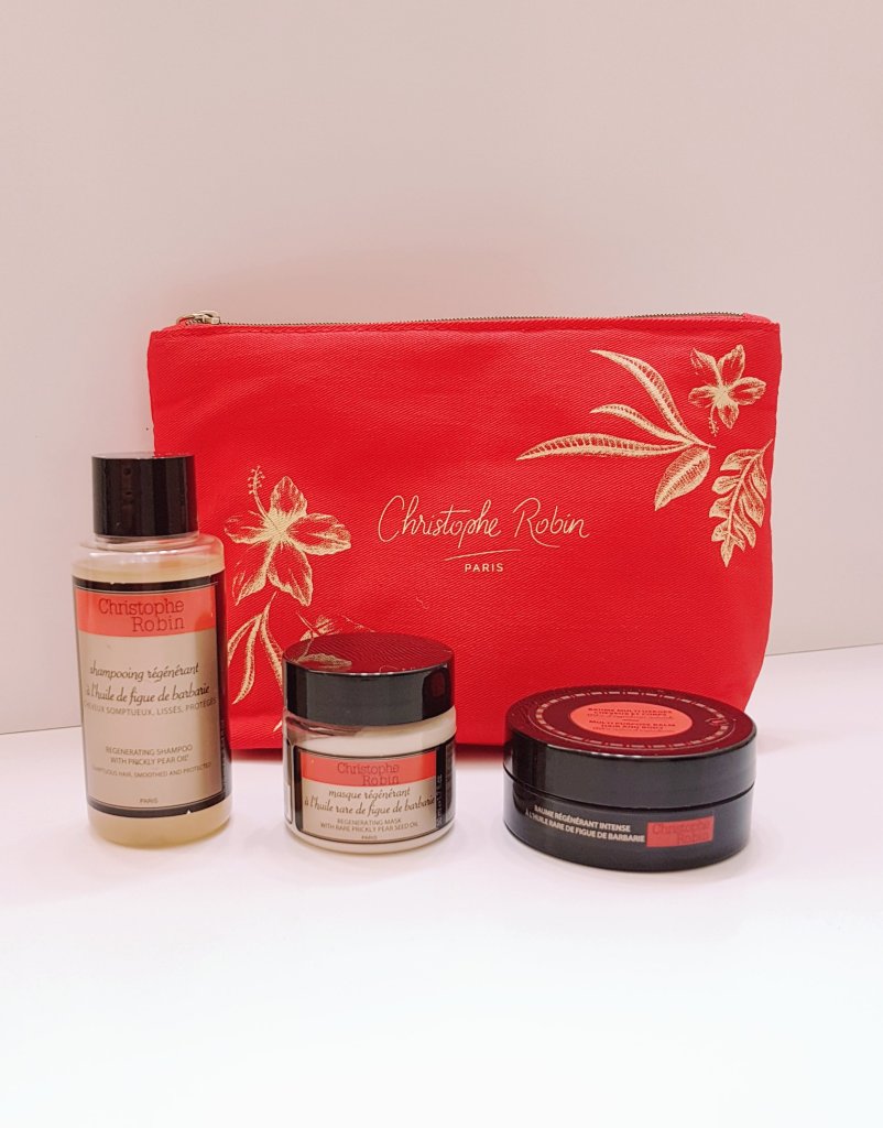 The Regenerating Hair Ritual line from Christophe Robin is a 3-piece kit containing, in a storage bag, shampoo, hair mask and balm that claims to moisturize, restore, repair and protect the hair from further damage while giving shine and color protection to the hair. All three products contain prickly pear seed oil, containing proteins, vitamin E and fatty acids for softness, protection and shine to the hair.
