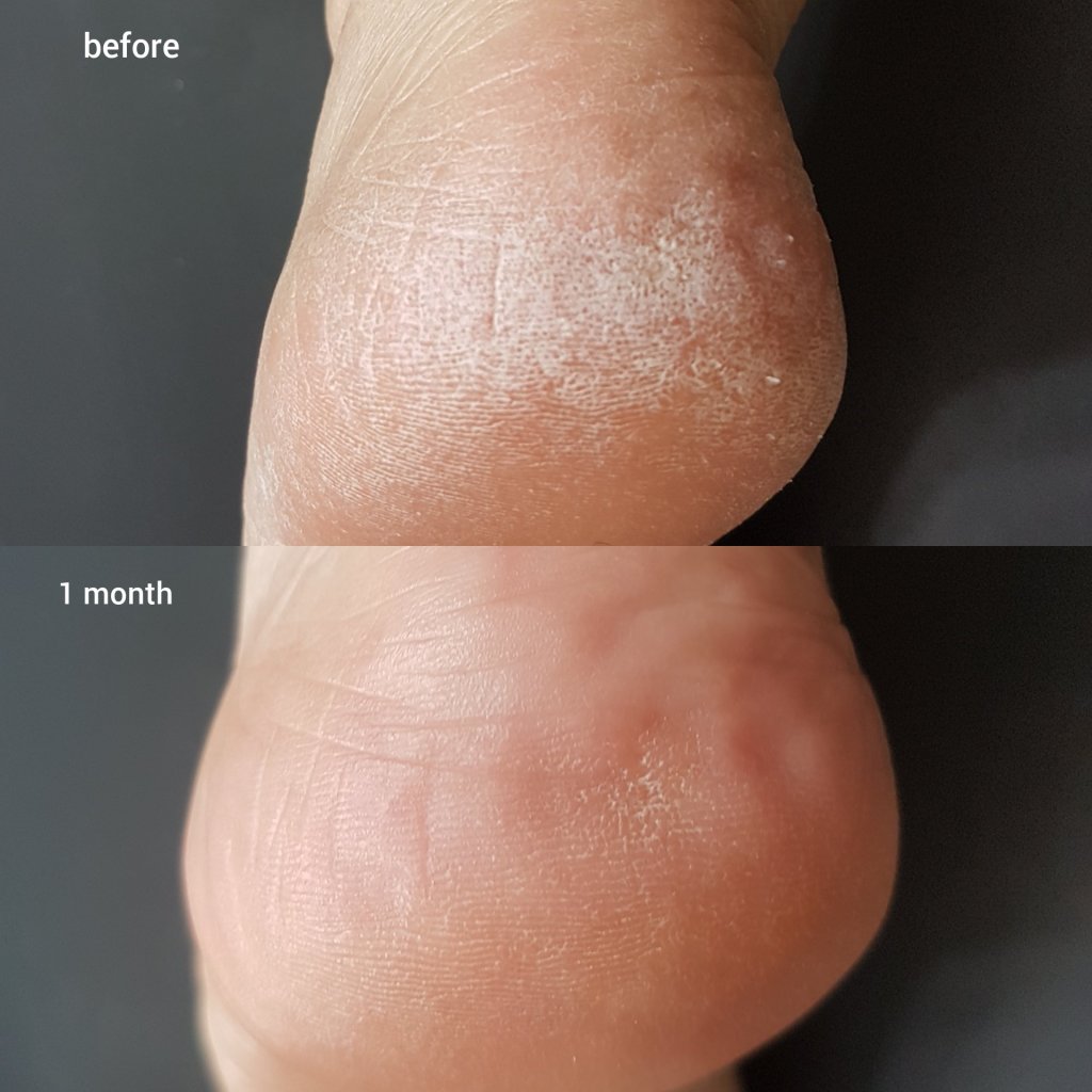 At one month, my skin felt softer, more hydrated and the roughness was gone. The callous on my big toe was more hydrated and softer, but still felt thick.