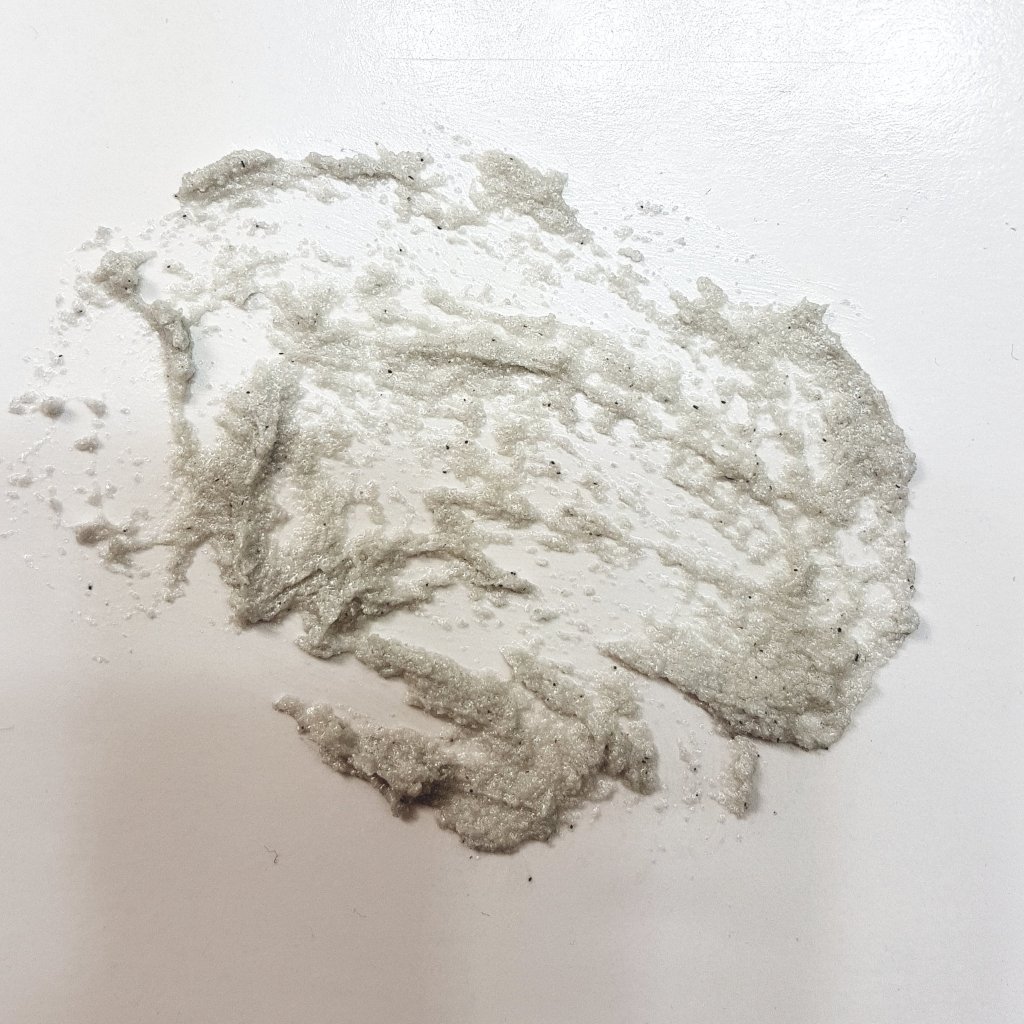 The product has fine-grain pumice that is not irritating when massaging on the skin. It has a mildly acidic scent. This rinses off well in the shower.