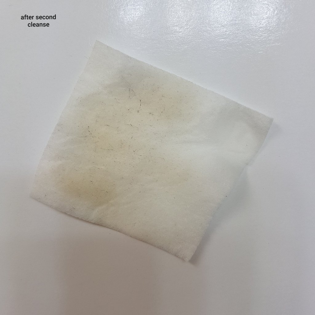 I do not find this to be a very effective cleanser. Wearing a medium to full coverage foundation and following the instructions for makeup removal, then patting the skin dry and using a toner, as in the photos above, there was a lot of foundation left on the skin after the first cleanse and still some slight color after the second (there are little fuzzies on the toner pad after patting the skin dry with a facecloth). The first cleanse did not form as many bubbles as the second. When wearing makeup and/or sunscreen I usually do two cleanses anyway or use an oil balm cleanser as a first step, however, that is a lot of makeup left on the skin for a first cleanse.