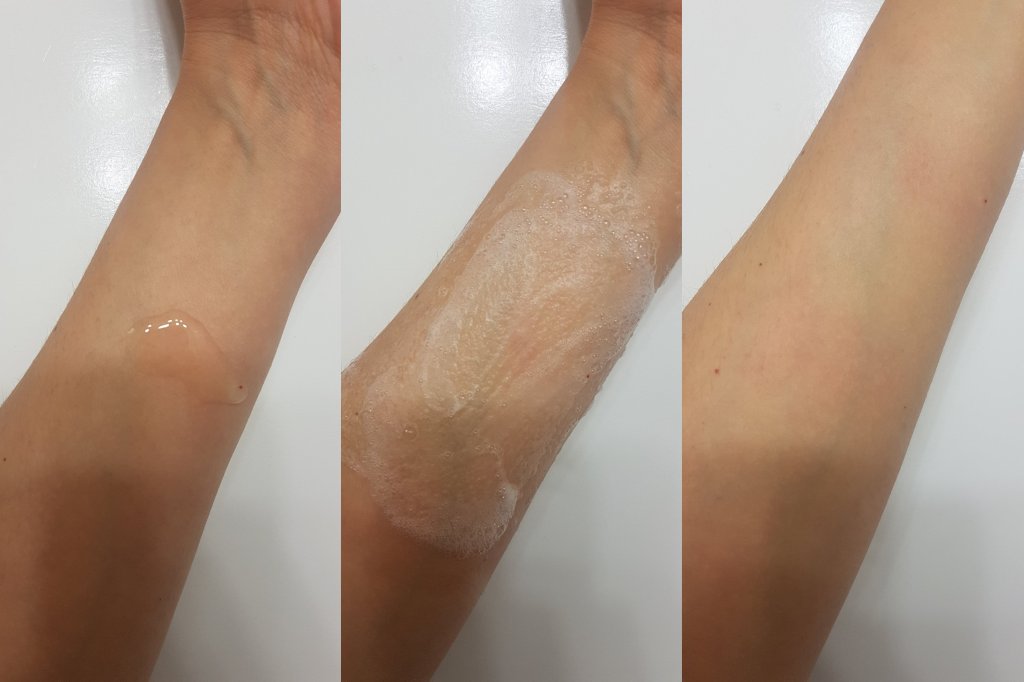 This is a light green gel-like cleanser that has a sweet, green scent. On wet skin, this lathers into light bubbles. Above, after I rinsed the cleanser, my arm had a couple blotchy red itchy patches which is an odd reaction for me. This did not happen to my face.