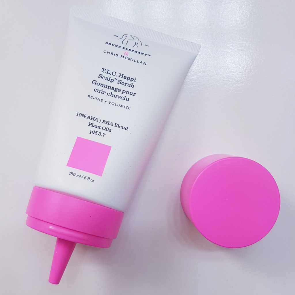 Drunk Elephant TLC Happi Scalp Scrub. Exfoliates the scalp. Hair feels lighter and has more volume. Makes a good exfoliant for the face as well.
