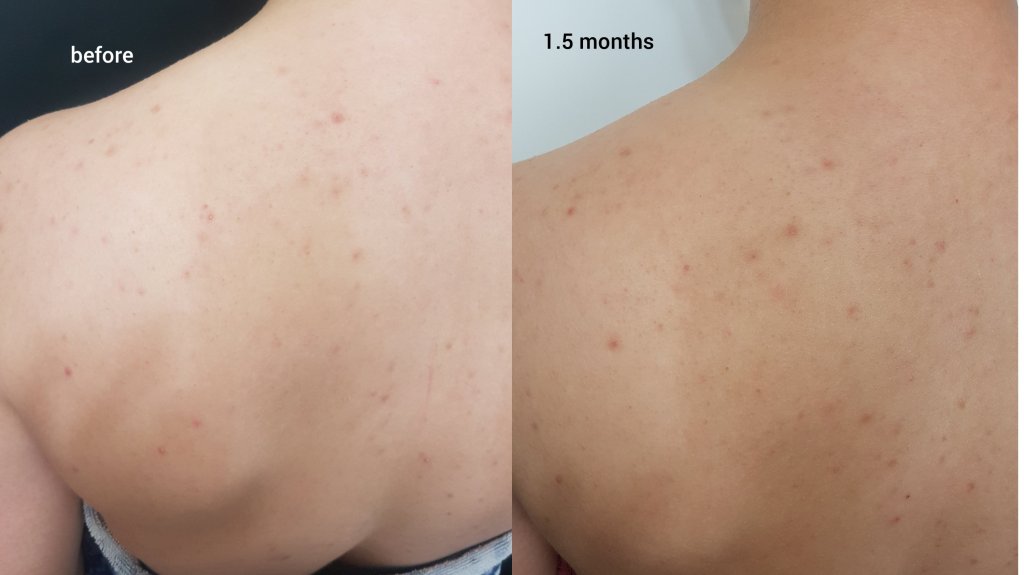 My teenage daughter and I both used the clarifying body spray, she for back acne for 1-1/2 months and me for chest acne for 4 months, once a the day in the evening. Her back has larger pimples and hyperpigmentation from the breakouts. My back has smaller pimples and whiteheads. The clarifying body spray is a fine mist that spreads easily, is easy to apply and dries fast. It was not drying to the skin. The scent of the product was odd, first smelling like alcohol for a couple seconds, then I thought a mix of almost a urine smell and licorice for a couple seconds (maybe the lemongrass?), however, the scent does not last long as the product dries very fast.
