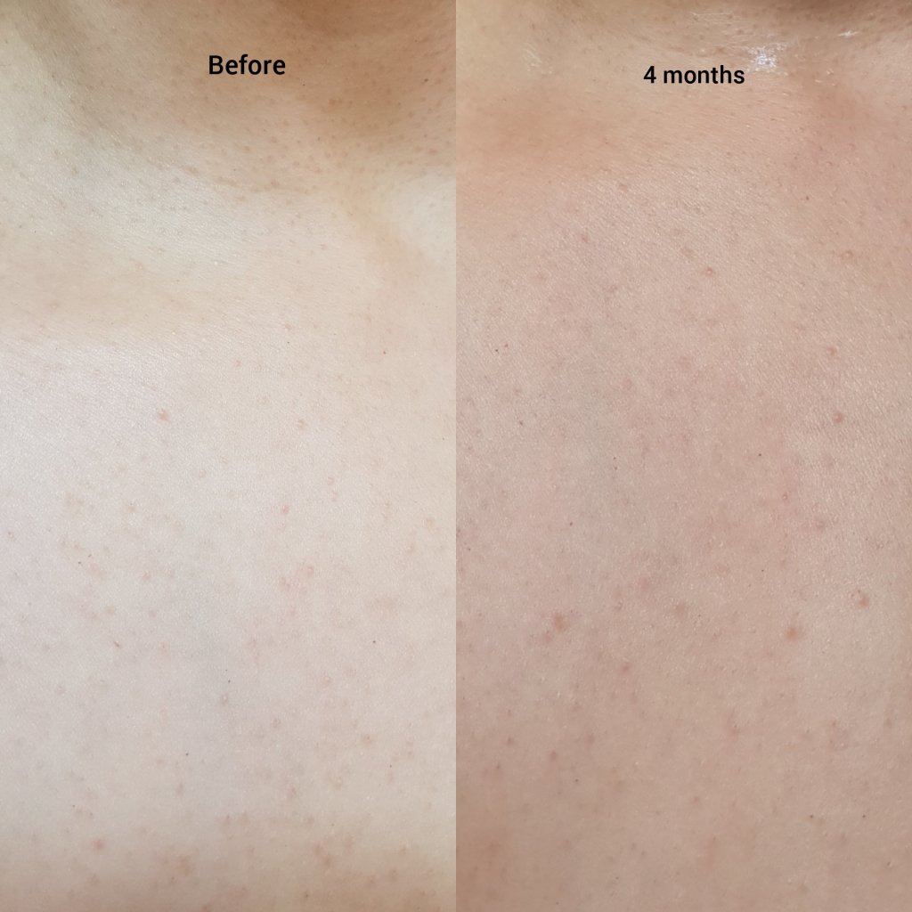 For me, I used daily in the evening for 4 months on my chest. I did not really feel a cooling or soothing effect, nor see a reduction in inflammation. This also did not help prevent new breakouts nor really improve the texture and breakouts already on the skin. I should add that I’m not sure if the breakouts on my chest are keratosis pilaris (this product has helped the KP on my legs particularly); my chest has looked like this for years now (KP is hard to improve and there is no cure), but the breakouts randomly look worse and better. The Murad body spray may not be as beneficial for KP as other products. In any case, I would not repurchase.