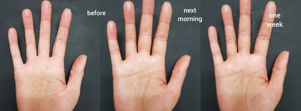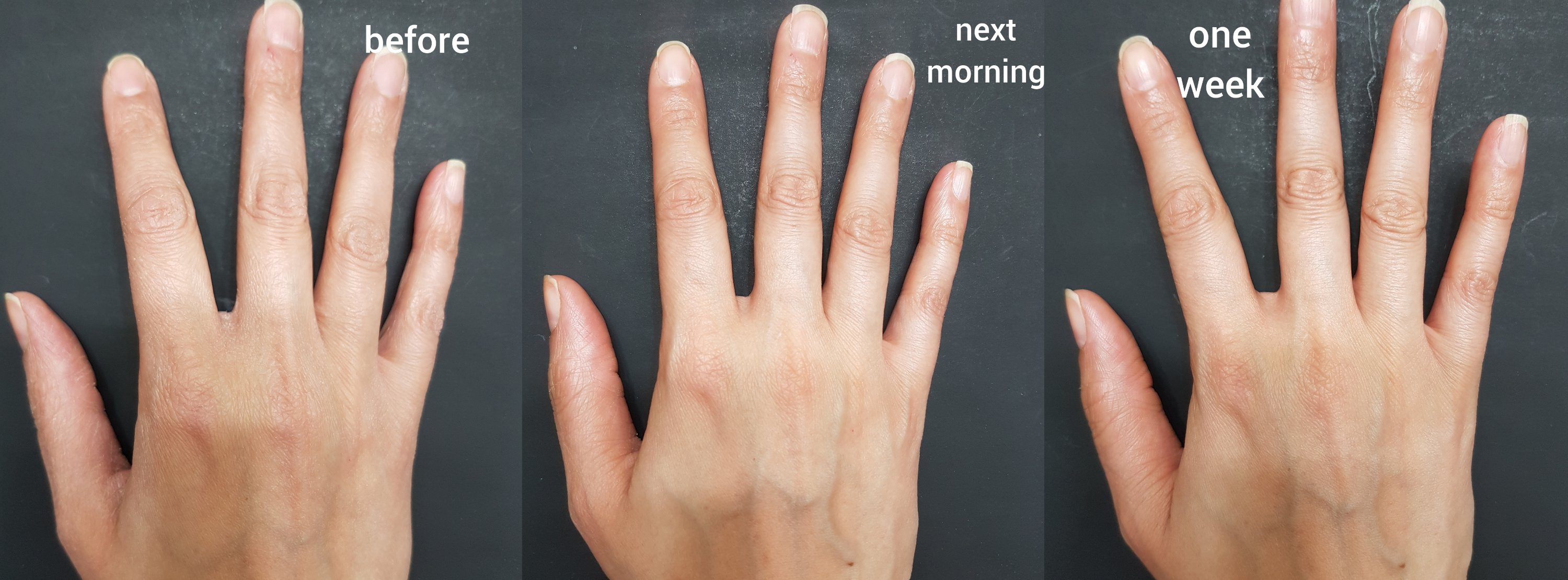 The morning after one application, my hands felt very smooth and moisturized. There was still some dryness on the knuckles and the thumb creases. After one week, the cuticles look better and my hands overall look and feel healthy, moisturized and smooth, and the dry thumbs and knuckles are improved. After hand washing, my hands still felt protected and smooth.