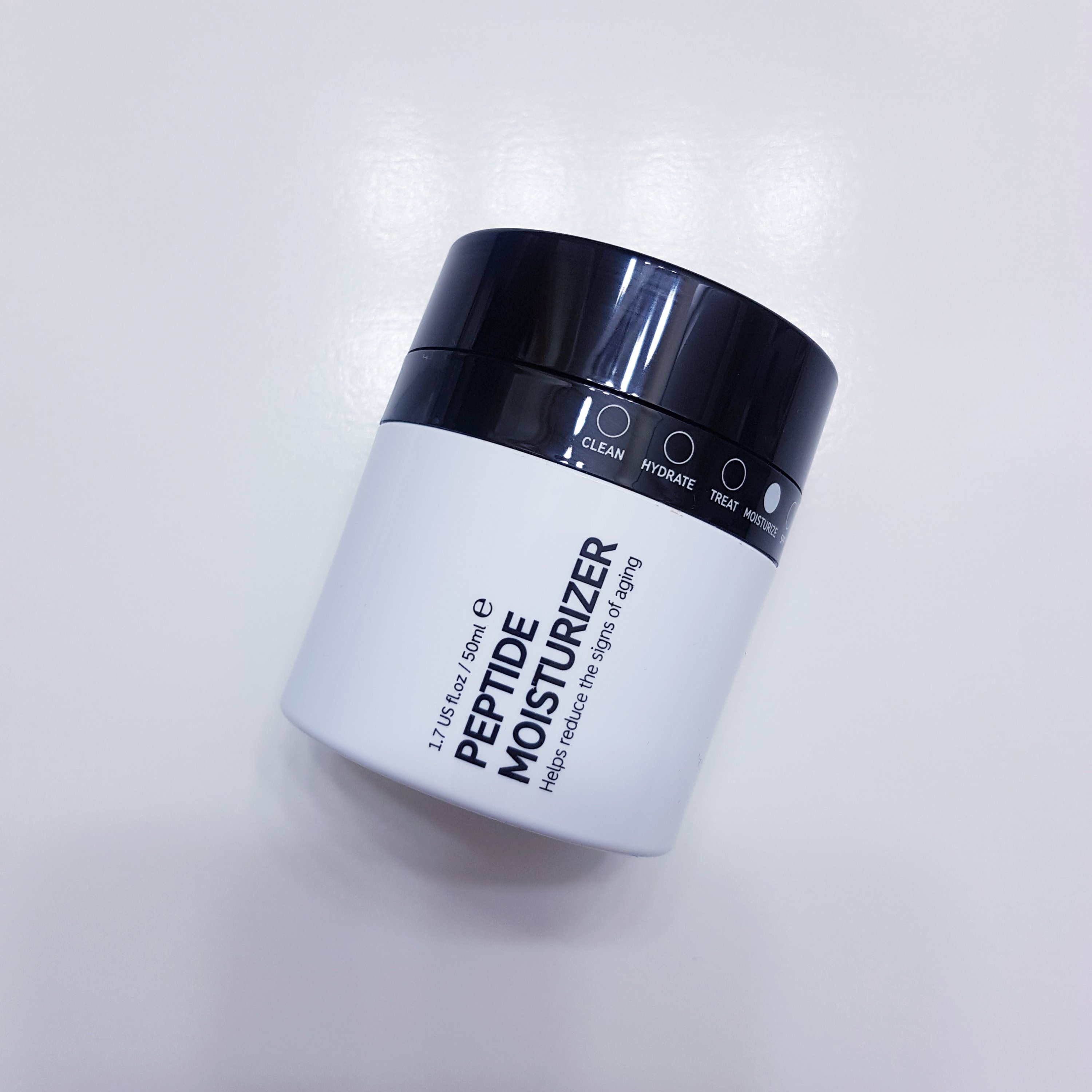 Peptide Moisturizer comes in a jar with a pump and has no added scent, but smells a bit medicinal (this smell lasts a few minutes and does not bother me). This is a medium-thick cream, described as “rich,” though I’m not sure I would actually describe it as such; I think it is generally similar to an average cream moisturizer. It spreads nicely over the skin. After initially applying, this product feels relatively moisturizing on oilier areas of the skin, particularly my nose, with a silky layer on the skin, however, on drier areas like my chin, I need to apply a couple layers. Foundation does not apply as nicely over this as other moisturizers I have used. The moisture lasts only 3 to 4 hours and I feel like I need to reapply. If I put some other hydrating or moisturizing serum underneath, my skin feels moisturized all day. For this purpose, I’ve used Indeed Labs’ Hydraluron Moisture Serum, Cosrx Snail Mucin Essence and surprisingly, the Vichy vitamin C serum ampoule seems to provide extra hydration as well; my skin feels more moisturized and protected than with the peptide cream alone just over a toner. I’m not sure if this is because Peptide Moisturizer does not have enough moisture or hydration for the skin or if it is ineffective in preventing water loss (and I have combination skin). Interestingly, it is stated on the jar to use hyaluronic acid under the moisturizer to draw in the peptides. I also need to use more than the recommended amount; I use one pea size for the face and one for the neck, with an extra layer or two on drier areas.
