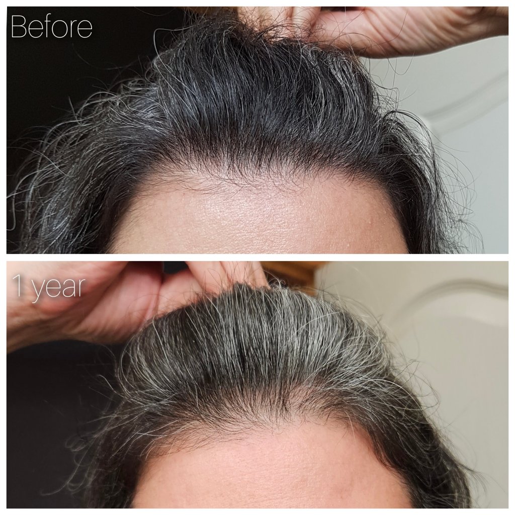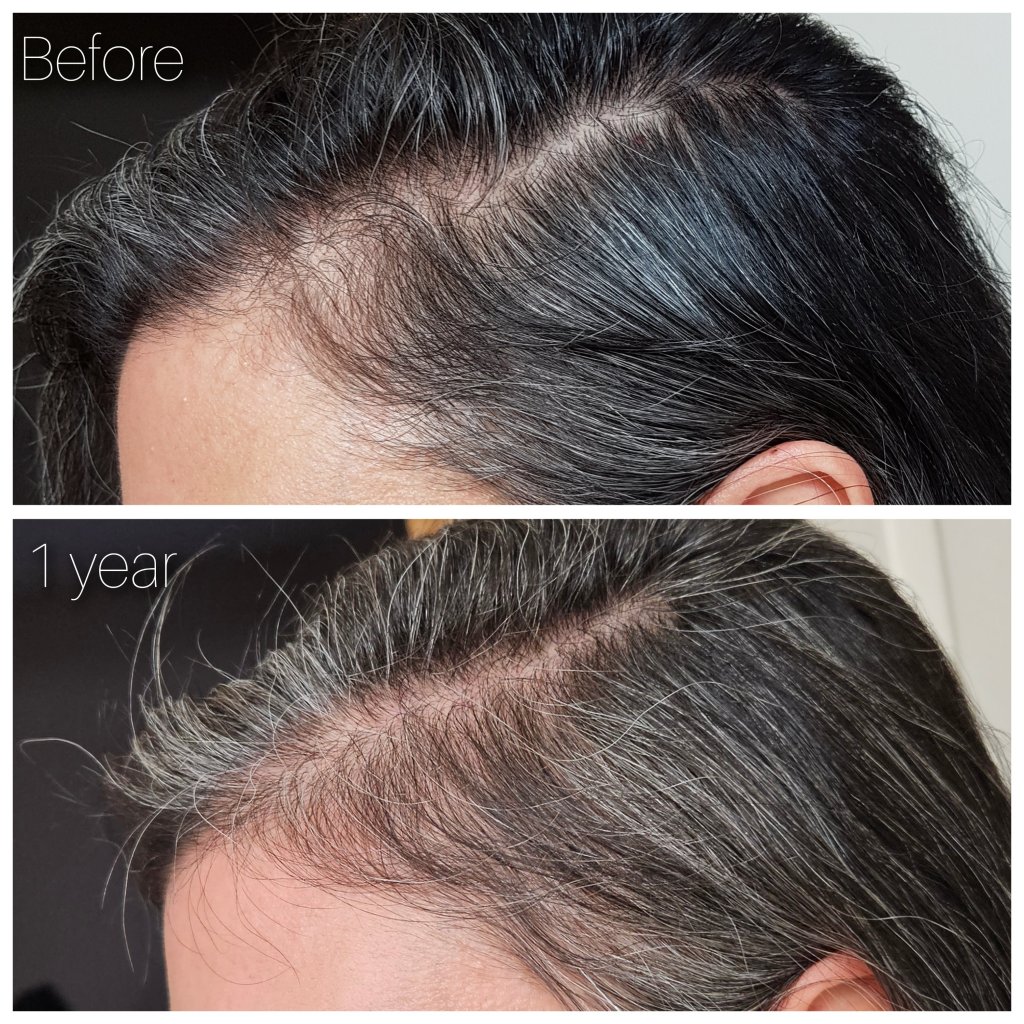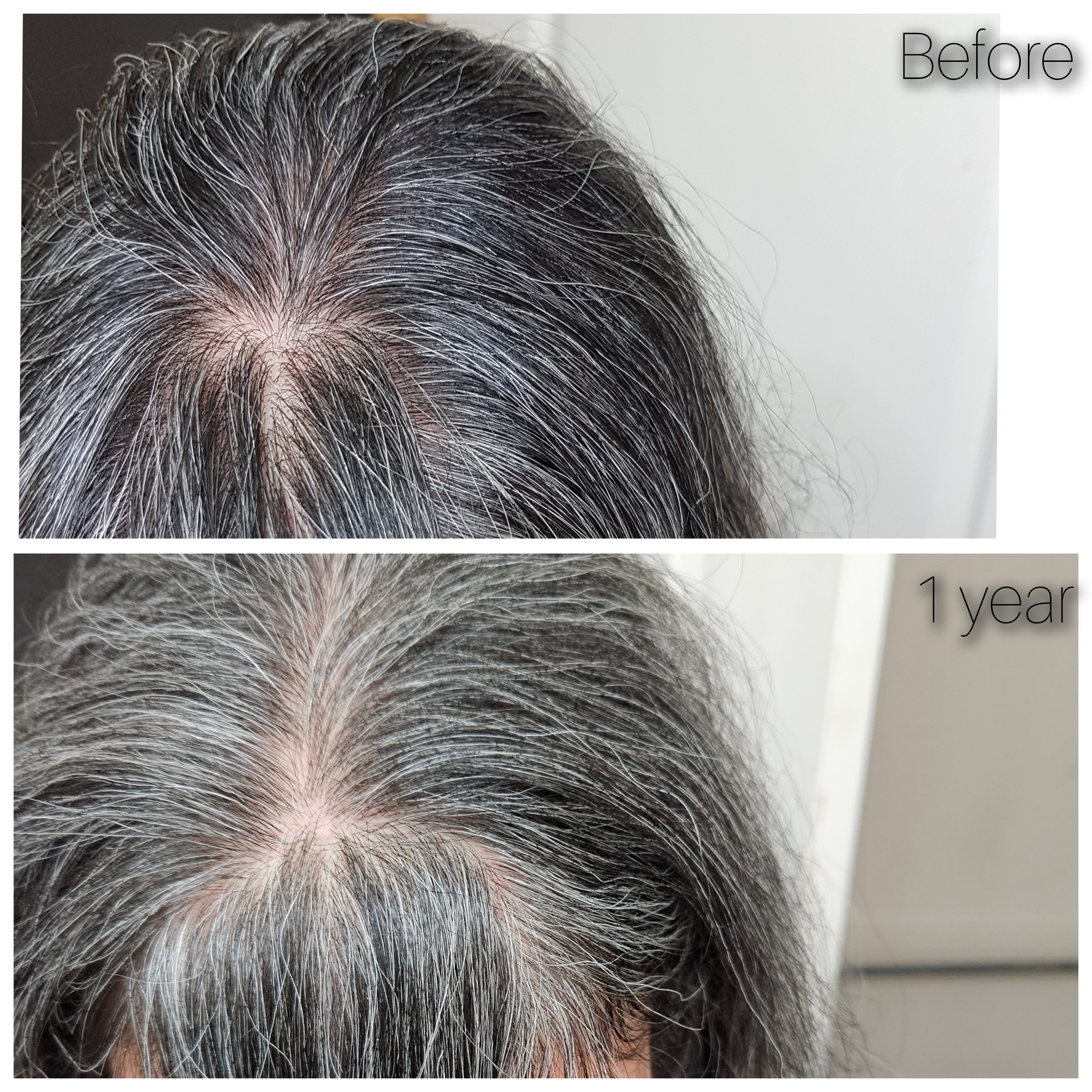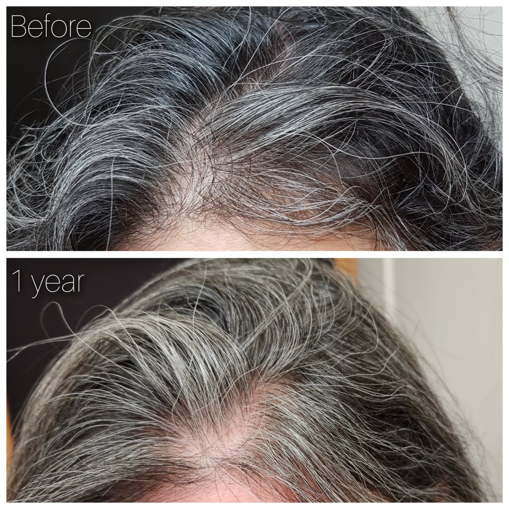 In the photos above, I see no results after 1 year of use. I did not notice any difference with scalp itchiness. While Hairmetto Topical Saw Palmetto Serum stimulated the scalp, felt nice with a cooling, tingling sensation, and seems to have the “right” ingredients for hair regrowth, this did not improve my thinning hair. I will not repurchase, and plan to start Rogaine (minoxidil). Rogaine remains the only FDA approved topical ingredient to regrow hair.