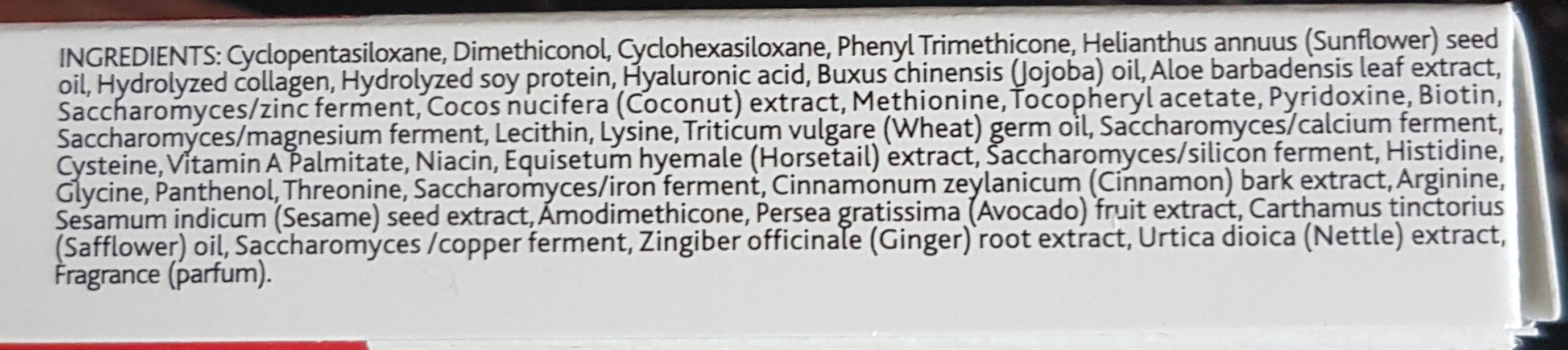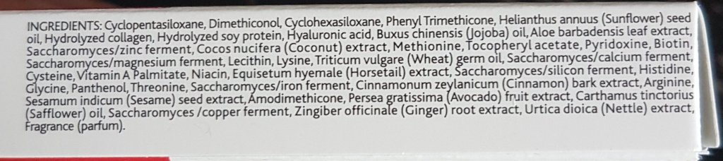 The hair oil contains a few silicones, vitamins, amino acids, hyaluronic acid, plant extracts and oils and proteins.
