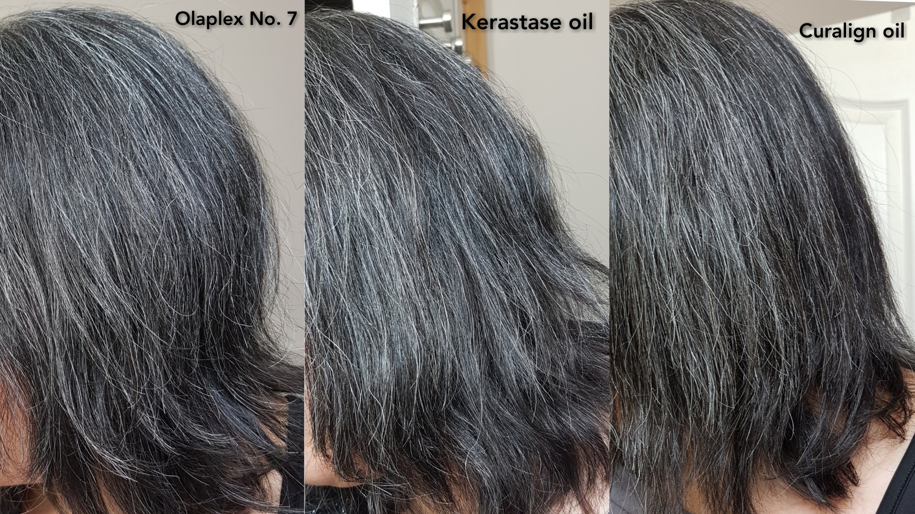 For each of the above photos, I added the respective oils to the hair when damp, blow dried and then did a quick flat iron (still using this one). These are perhaps not the most accurate for the look of the hair because I used minimal heat and large sections to minimize heat damage; I am getting my hair colored next month and want it to be as healthy as possible (I am so looking forward to covering all this grey hair). The Curalign oil provided the best results in terms of smoothing and straightening the hair and adding shine and a sleek feel. The next day my hair was still straight, felt very smooth and had no poof (I usually get poof on my flat ironed second day hair).